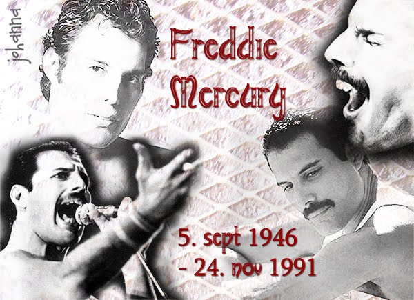 i thought the perfect theme would be to make an homage for freddie mercury, who died 20 years ago. what a voice – what a man!!! listened to teo torriatte several times (wonderful ballade, not heard as often as the biggest hits), while looking for pics in the net and also found the queen font to fit the collage.
