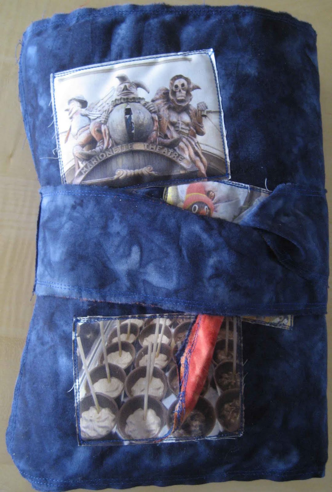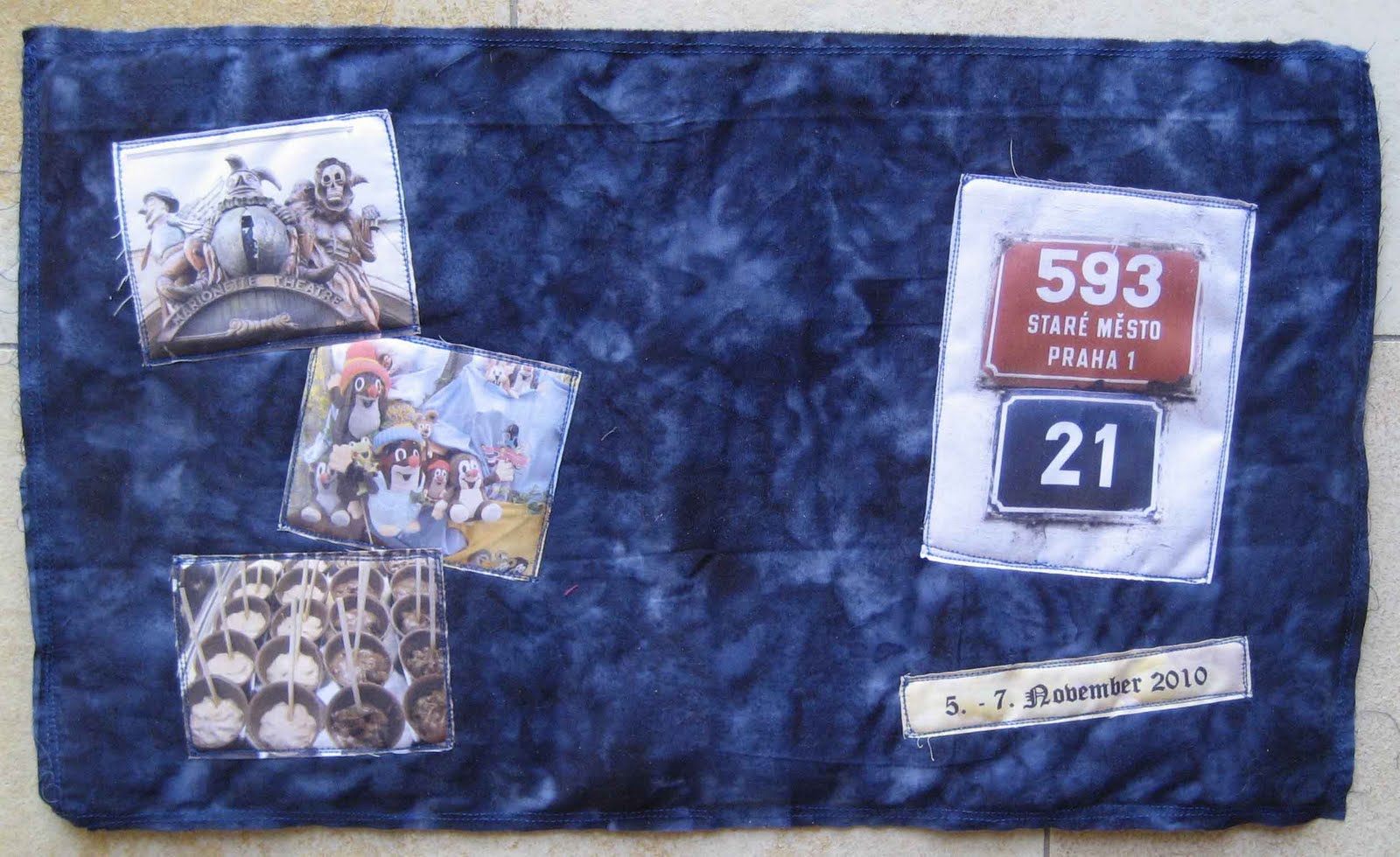 page 9: charles bridge. three tags (size of tim holtz´ die) with photos and text bound to a blue stripe of eyelet twill.