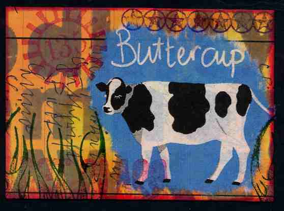 the current challenge at three muses is just my taste… made this fabric atc with an old zetti textstamp and a collage picture from teesha moore.