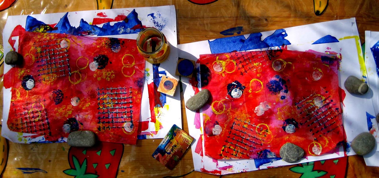 played with acrylics out there (it was a little windy, so i used the stones to keep them in place)… made some background à la marilyn rock style (watch her videos 1 and 2 on her blog!)… finally found (with the help of femmy) some papers which should come near the quality of the american deli papers…