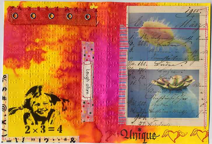 auf der rechten hälfte habe ich zuerst mit gestreiftem tape eine atc-hülle aufgekebt; dann festgenäht. soll ein tag hineinkommen.
