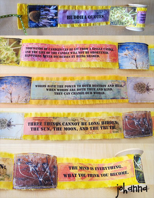 wie ich liebt sie sprüche, deswegen hab ich mal ein paar zusammengetragen (als oberbegriff kristallisierte sich “buddha” heraus…). hab die sprüche auf ausschnitte meiner gesprayten & gescannten hintergründe getippt und auf stoff ausgedruckt. ebenso auf stoff gedruckt sind die miniaturen meiner kürzlich fotografierten und bearbeiteten fotos… so konnte ich mal wieder prima meine verschiedenen leidenschaften kombinieren… habe die bilder und sprüche abwechselnd auf ein langes gelbes stoffband genäht, dieses an eine hölzerne garnspule geklebt. dann lässt es sich aufwickeln wie eine spruchrolle. am schluss sorgt ein eyelet mit einem bändel dafür, dass die rolle zusammengehalten wird. oben und unten noch ein passendes bild drauf geklebt, fertig.