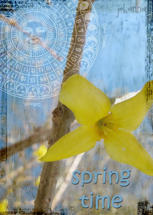 but for today a photo i made on tuesday, the ONE really sunny day of last week – a forsythia blossom (>SPA). i edited it for the time-theme at take a word, adding a scan of an old moon calendar. layered kim klassen´s “word” texture twice for TT.