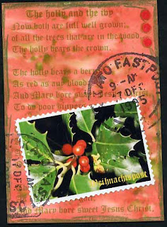 printed this song onto the dyed background, created a faux postage of a holly and stamped it with cancellation stamp from ma vinci.
