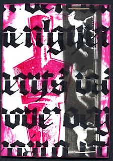 plastic bag with script on it, stamped with stazon red (stamp from acey deucy), muybridge transparency (3 horses) tucked on with staples.