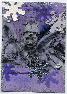 for this week´s challenge i punched snowflakes from various papers and used the punched hole as a stencil to dab some snowflake shadows. angel is on transparency, edges heat-embossed with silver powder.