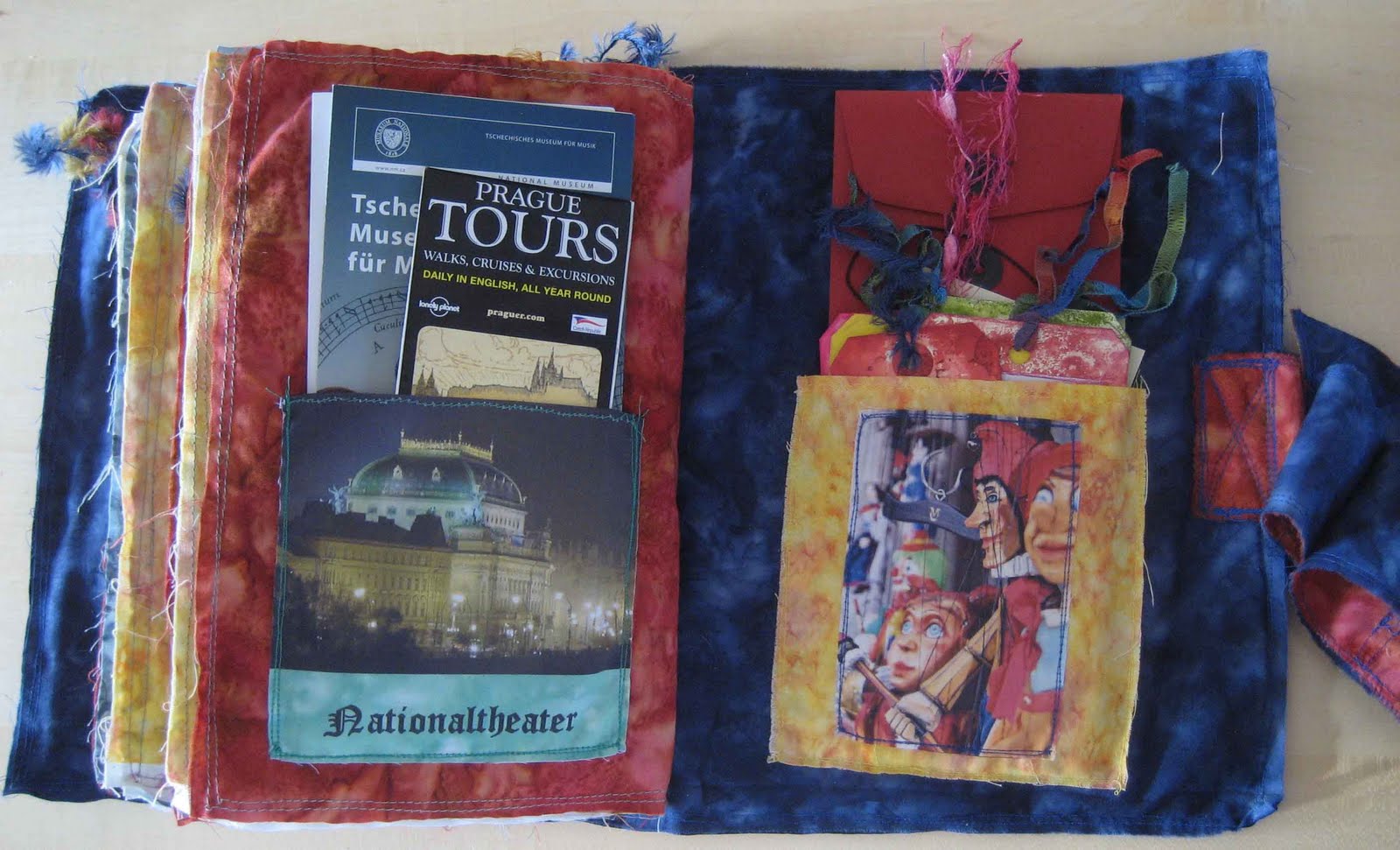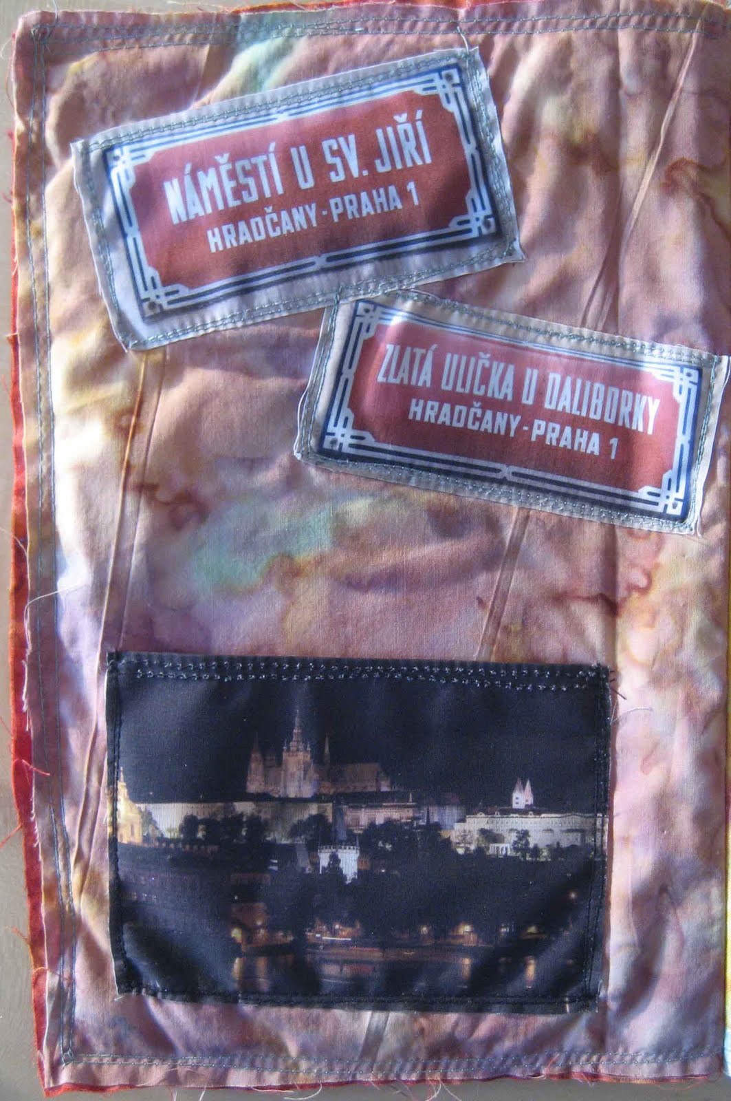 page 9: charles bridge. three tags (size of tim holtz´ die) with photos and text bound to a blue stripe of eyelet twill.